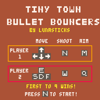 Yeehaw, partner! In Tiny Town Bullet Bouncers, two players take control of the Sheriff and the Bandit, and shoot bouncing bullets around town, hoping that they hit their opponent before they hit you! But be careful - the town is constantly shrinking, giving you less and less space to move around!